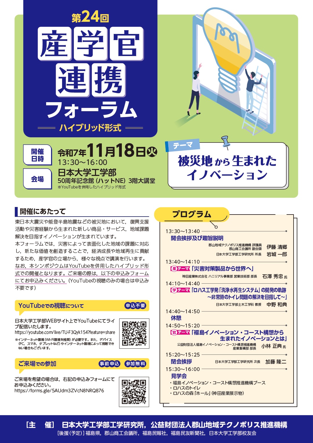| 内容 | 13:30~13:40 開会挨拶及び趣旨説明 公益財団法人郡山地域テクノポリス推進機構評議員(郡山商工会議所副会頭)伊藤 清郷 日本大学工学部工学研究所 所長 岩城 一郎 13:40~14:10 「災害対策製品から世界へ」 神田産業株式会社 ハニリアル事業部 営業技術部 部長 石澤 秀忠 氏 14:10~14:40 「ロハス工学発「洗浄水再生システム」の開発の軌跡~非常時のトイレ問題の解決を目指して~」 日本大学工学部 土木工学科 教授 中野 和典 14:40~14:50 休憩 14:50~15:20 「福島イノベーション・コースト構想から生まれたイノベーションとは」 公益財団法人福島イノベーション・コースト構想推進機構 産業集積部 部長 小林 正典 氏 15:20~15:25 閉会挨拶 日本大学工学部 工学研究所 次長 加藤 隆二 15:30~16:00 見学会 ・福島イノベーション・コースト構想推進機構ブース ・ロハスのトイレ ・ロハスの森「ホール」(神田産業展示物) |