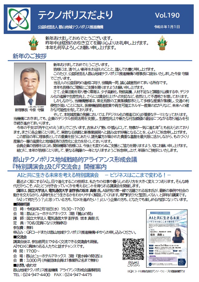 HOME 公益財団法人郡山地域テクノポリス推進機構 その他 2026.1.5 テクノポリスだより 令和8年1月号(Vol.190) 「テクノポリスだより」令和8年1月号(Vol.190)を発行しました。 内容は次のとおりです。 ・新年のご挨拶(新理事長 今泉守顯) ・「特別講演会」及び「交流会」開催案内 ・「健康医療福祉産業創生フォーラム」開催案内 ・「企業連携促進セミナー」開催報告 ・須賀川方部アドホック研究会海外視察研修 報告 ・郡山市あさかの学園大学サイエンスツアー 報告 前の記事へ 戻る