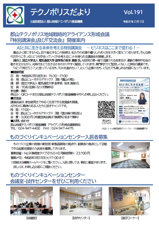 HOME 公益財団法人郡山地域テクノポリス推進機構 その他 2026.2.2 テクノポリスだより 令和8年2月号(Vol.191) 「テクノポリスだより」令和8年2月号(Vol.191)を発行しました。 内容は次のとおりです。 ・郡山テクノポリス地域戦略的アライアンス形成会議 「特別講演会」及び「交流会」開催案内 ・ものづくりインキュベーションセンター入居者募集 ・ものづくりインキュベーションセンター 会議室・試作センターをぜひご利用ください ・第13回「健康医療福祉産業創生フォーラム」開催報告 ・「秘密情報管理と情報セキュリティ」セミナー開催報告 前の記事へ 戻る