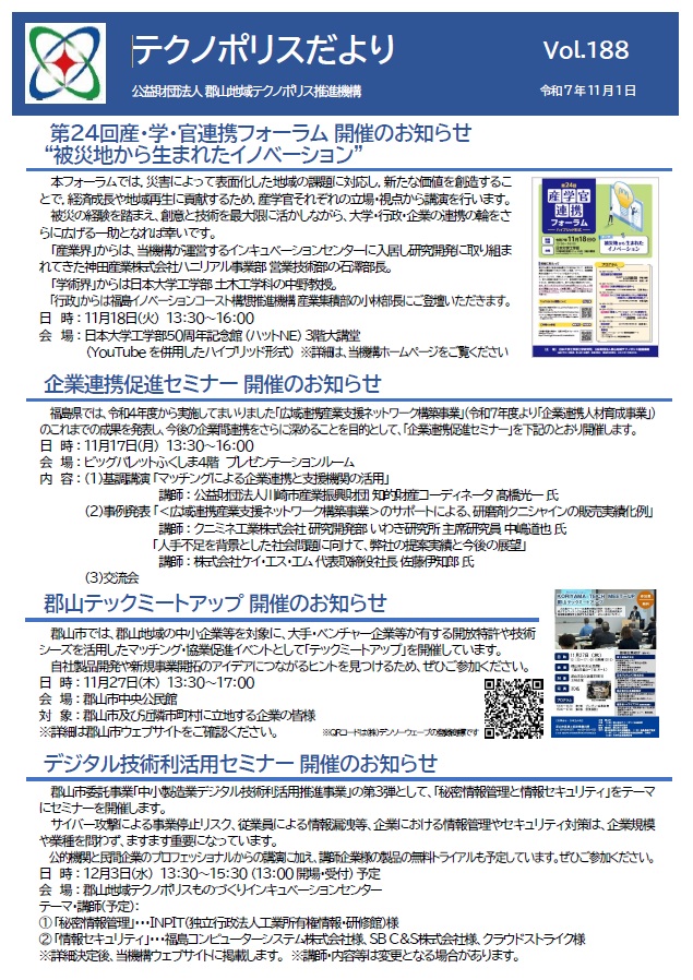 - ・【コラム】郡山テクノポリス地域戦略的アライアンス形成会議会員企業から 笠間 啓造 氏(株式会社メカテック 代表取締役会長)